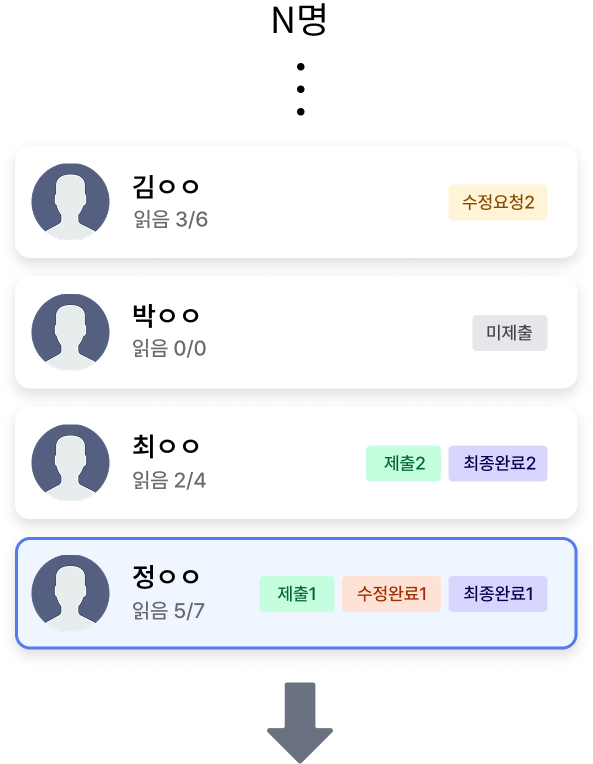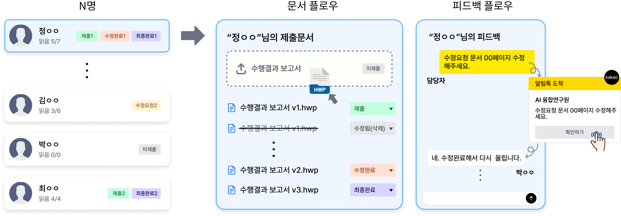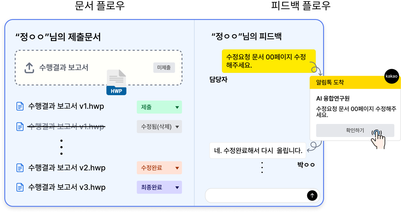 문서 피드백은 카카오톡을 통해 실시간 전송되며, 여러 명의 제출 상황을 빠르고 효율적으로 정리할 수 있습니다.